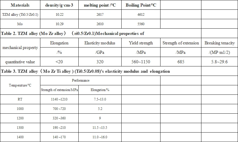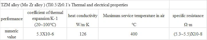 are compared with those of pure molybdenum in Table 1. TZM alloy has good mechanical properties, especially better than pure molybdenum at high temperature. Table 2 shows the mechanical properties of TZM(Ti0.5/Zr0.1) alloy, and Table 3 shows the tensile strength and elongation of TZM(Ti0.5-ZR0.08) alloy at high temperature. Table 4 shows the thermal and electrical properties of TZM alloy (Ti0.5/Zr0.1).
